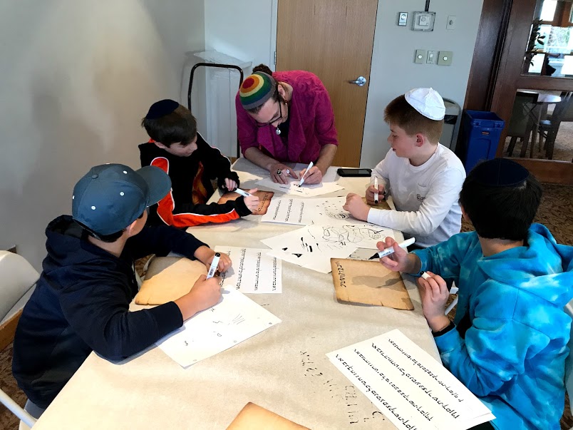 I host scholars-in-residence to model celebrations of diverse Jewish life for congregants of all ages. Past speakers have included Noam Sienna, editor of A Rainbow Thread: An Anthology of Queer Jewish Texts from The First Century to 1969 and Rabbi Lauren Tuchman, the first blind, female Rabbi. I collaborate with Keshet in crafting tailored professional development for senior staff and Hebrew school staff focused on creating a welcoming synagogue and working with diverse populations in the classroom and beyond. Pictured: scholar-in-residence Noam Sienna teaches fifth and six graders about Jewish scribal traditions, modeling an egalitarian approach to sofrut (scribal arts used in Torah scrolls and mezuzah).