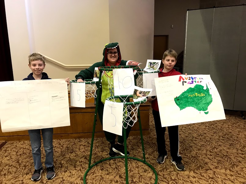 Pictured: seventh graders present their final project from Holocaust course (emphasizing positive identity formation) and original game for families at the Purim carnival.